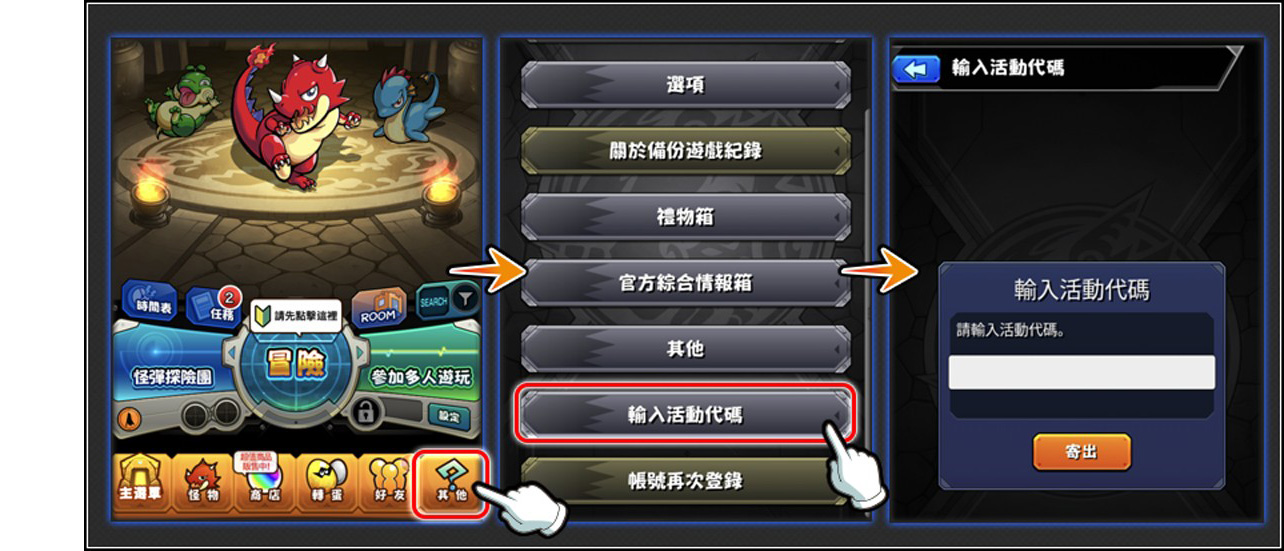 • 怪物彈珠虛寶兌換方式:【1】請複製「虛寶序號」【2】從《怪物彈珠》主畫面點選「其他」【3】點選「輸入活動代碼」【4】輸入「虛寶序號」後點選「寄出」即可!